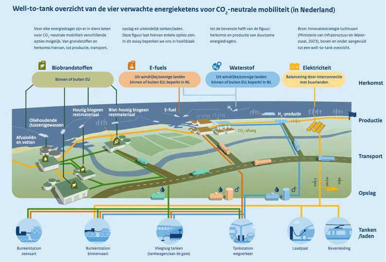 Het Kennisinstituut voor mobiliteitsbeleid(hierna: het KIM) heeft een reflectie gepubliceerd over de energietransitie inmobiliteit en hoe daarvoor adaptief beleid nodig is. Op basis van PBL/TNO(2024) schets het KIM de ontwikkeling van de energiemix in mobiliteit van nunaar 2050 en geeft het aan hoe de achterliggende productieketens eruit zien:een mix van import en decentrale productie in Nederland (en Europa). Het KIM wijst erop dat betaalbare en alom beschikbare energie de basis is voor onshuidige mobiliteitssysteem (en voorandere sectoren). De opgave is om de grote afhankelijkheid van fossiel aardolie te vervangen door andere energiedragers,die allemaal hun eigen productieketens kennen. Dat vergt een enorme omslag inde onderliggende fysieke energie-infrastructuur en de manier waarop actoren samenwerken. Daarbij raakt de energie-infrastructuur voor mobiliteit op andere manieren verweven met en ook afhankelijk van die van andere sectoren.